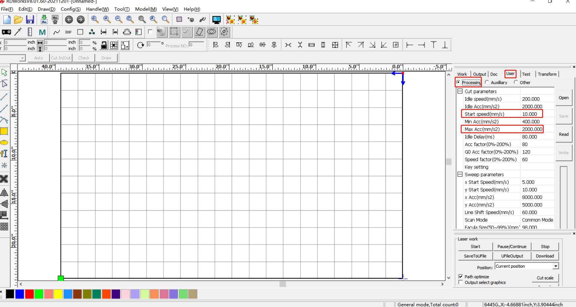 - Lower the value of "Start speed" and "Min Acc" either through RDworks or LightBurn, depending on which software is being used (as shown).